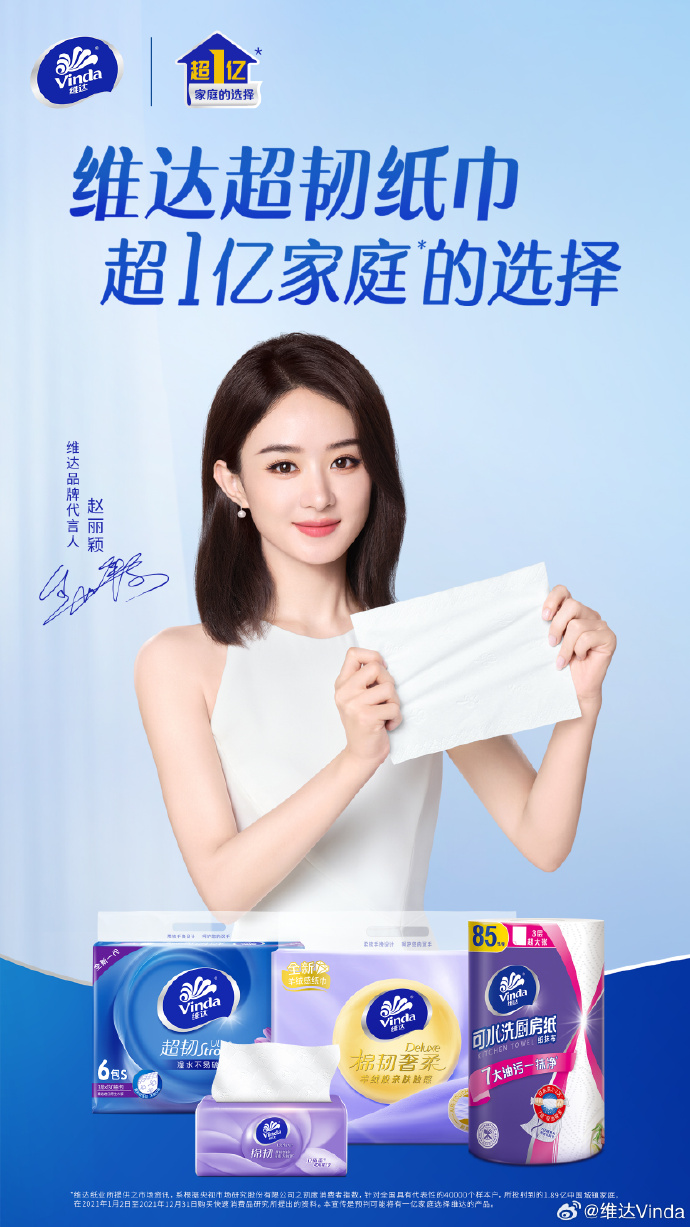 維達紙巾韌性柔軟與結實的出色搭配,又如國民演員趙麗穎一般堅韌不失溫柔,這次維達與趙麗穎共同攜手,為億萬消費者帶來高品質的生活用紙,為他們帶來生活中每一個小細節的健康與呵護。